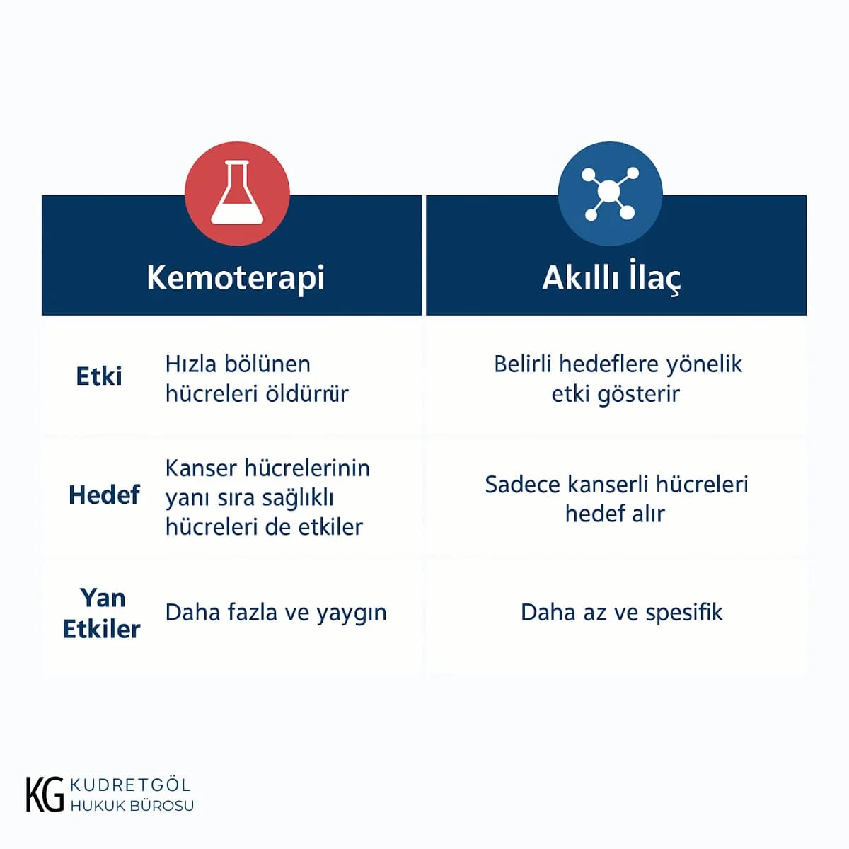 Kan kanserlerinde akıllı ilaçların en çok karşılaştırıldığı tedavi yöntemi kemoterapidir. Kemoterapi, uzun yıllardır kanser tedavisinin temel taşlarından biri olmuştur. Ancak bu tedavi, hızlı bölünen tüm hücrelere saldırdığı için yalnızca kanserli hücreleri değil, saç kökleri, sindirim sistemi ve kemik iliği gibi sağlıklı hücreleri de etkiler. Bu durum, saç dökülmesi, mide bulantısı, enfeksiyon riski gibi ciddi yan etkilere yol açar.